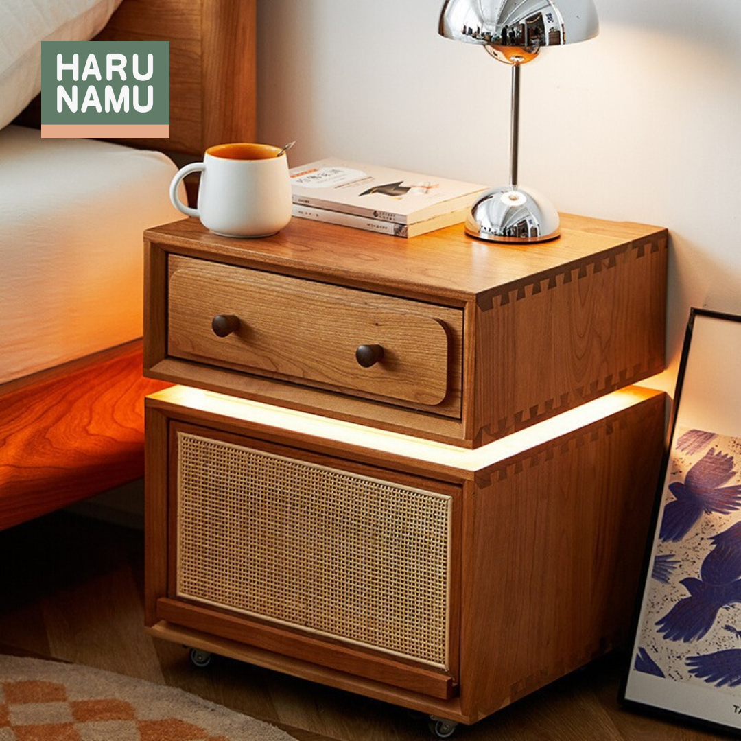 A soft glow, built into structure. The AKIO Solid Wood Bedside Cabinet layers utility with quiet charm. A discreet light strip casts a gentle radiance, illuminating the space without intruding on the calm.