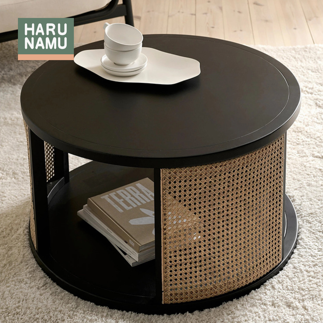 Bold yet balanced, the YUMEKO Round Rattan Solid Wood Coffee Table contrasts deep black wood with the airy texture of handwoven rattan. Its circular form softens modern interiors, while the open lower shelf offers practical space for books, trays and other essentials.